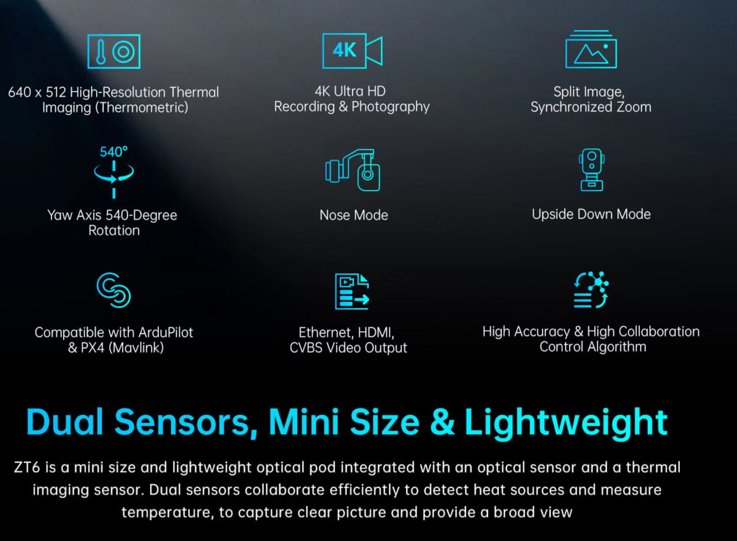 The demand for drone applications is increasing: Drones are increasingly being used in security monitoring, search and rescue, industrial inspection, and other fields. These application scenarios require drones to be able to obtain more comprehensive and clear image information. They need to be able to see the images under visible light conditions and also detect thermal imaging information to meet requirements such as night monitoring and fire source detection. The dual-sensor design of the ZT6 Mini Dual-sensor optical pod can effectively detect heat sources, measure temperatures, capture clear images, provide a wide field of view, and can well meet the application requirements of drones in these fields.